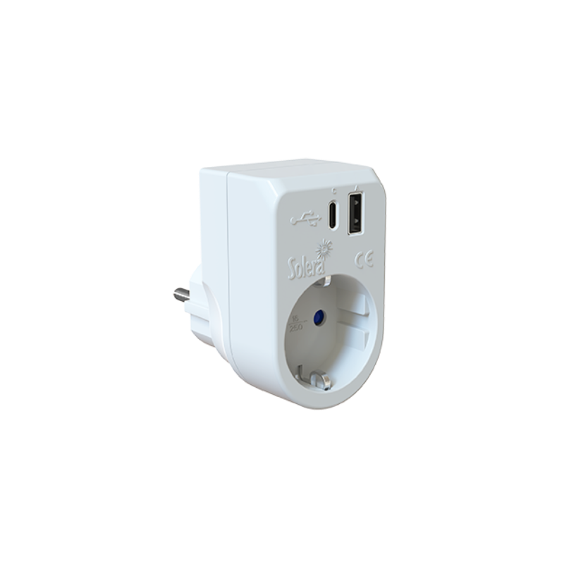 Adaptador 2P+T, 16A 250V~. Potencia máxima 3680W . Con USB tipo A y USB tipo C 3A 5Vdc. Potencia máxima 15W Color blanco. Clavija con doble sistema de tierra.
