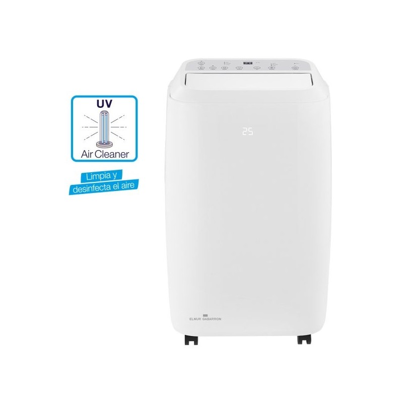 Aire acondicionado portátil con lámpara UV, 4 modos de uso, bajo consumo y para estancias hasta 30 m². Incluye mando, temporizador y ruedas 360°.