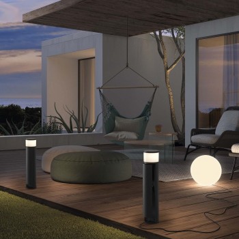 Nuestra Baliza lunar, El bolardo Lua se caracteriza por su diseño sencillo y contiene dos tomas schuko integradas protegidas por una puerta frontal. Adecuadas para cargar una potencia total de hasta 3.680 vatios, las tomas schuko (compatibles con enchufes F y C) cuentan con tapas abatibles y seguro para niños. Incluye caja de conexiones estanca con conexión independiente para la lámpara y casquillos schuko. Fabricada en aluminio e IP44, está disponible con lámpara G9 incluida en 3000K y acabado antracita. Gracias al difusor opalino superior, la luz de la lámpara crea un efecto de iluminación visualmente discreto para exteriores. Es un bolardo ideal para proporcionar suministro eléctrico en jardines, patios, terrazas o caminos.