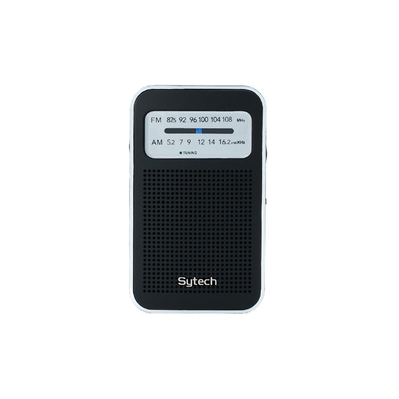 Radio de bolsillo SYTECH AM/FM con entrada para auriculares y diseño compacto en color negro.